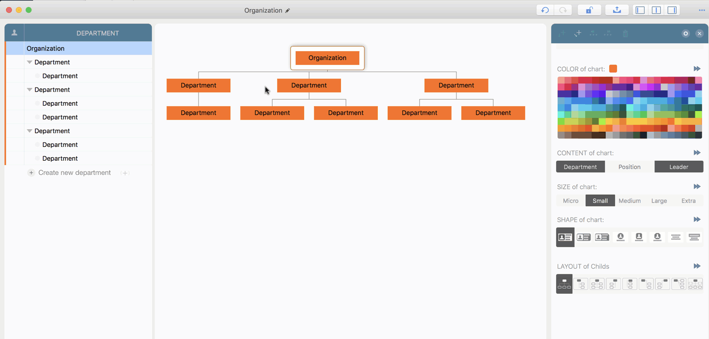 OrgChart supports to maintain the departments on outline, chart and updating panels.