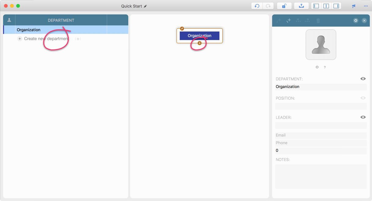 Or on the chart panel, click to select a department, then click “+” button to add a child.