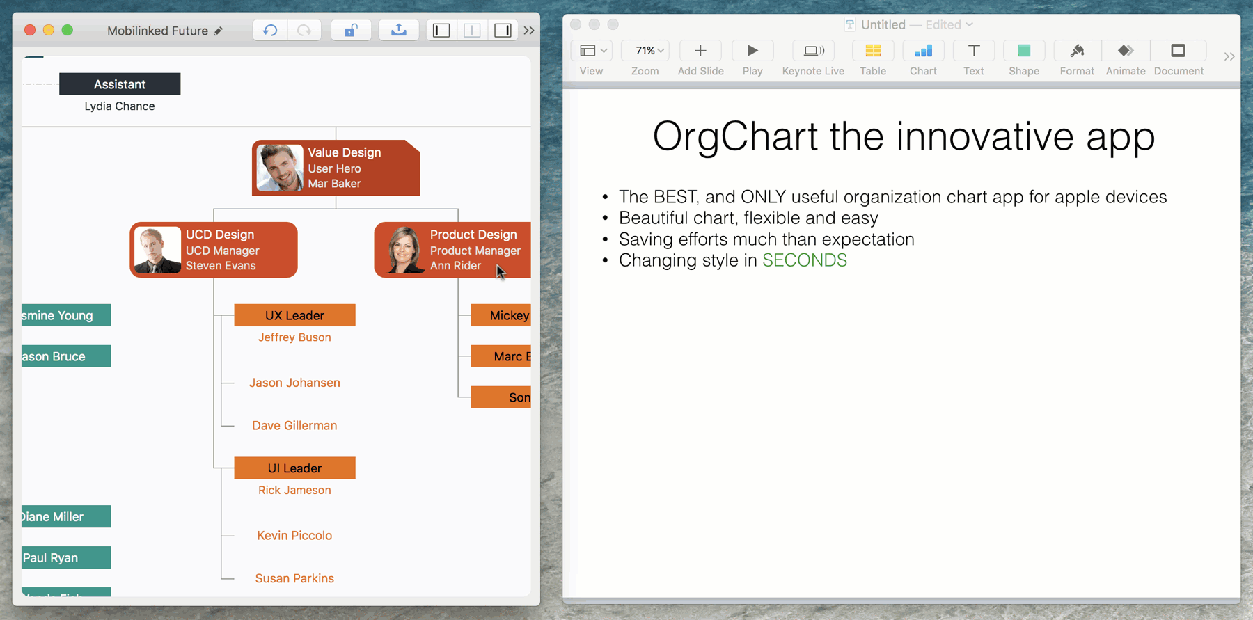 Another feature related to reporting purpose – we can drag a department from chart panel to other apps (such as Apple paper) as a image, for create reporting documents freely.