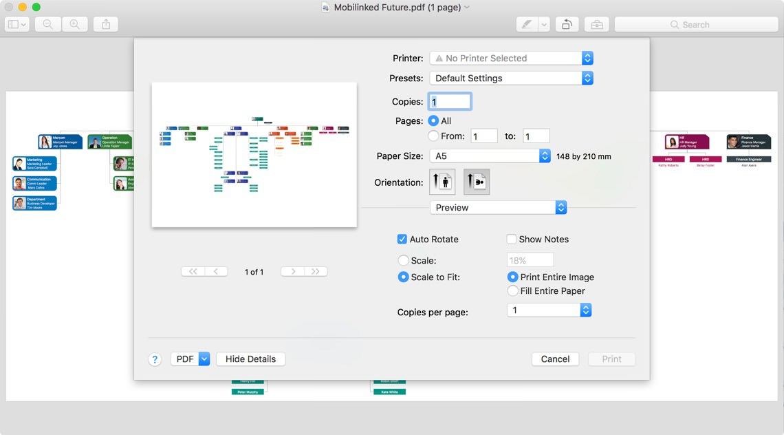 As the macOS devices have much stronger hardware resource than the iOS devices, by default OrgChart will export the organization chart as PDF file in one page. And macOS is a much more open OS, which provides more options when printing the PDF file, such as margin, zoom, etc.